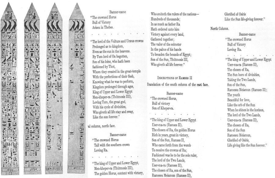 Восточная, северная, западная и южная стороны обелиска, соответственно (слева) и иероглифы обелиска с переводом (справа)[16]