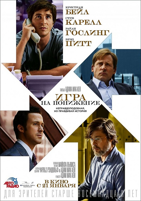 «Игра на понижение» (англ. The Big Short) — фильм Адама Маккея, посвящённый событиям ипотечного финансового кризиса 2007—2008 годов[3]. Сценарий фильма основан на книге Майкла Льюиса «Большая игра на понижение. Тайные пружины финансовой катастрофы». Главные роли сыграли Кристиан Бейл, Райан Гослинг, Стив Карелл и Брэд Питт[4][5]. Дебютный показ состоялся в рамках фестиваля AFI Fest 22 сентября 2015 года.