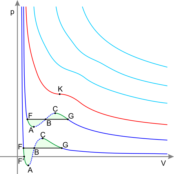 где — число молекул в газе. Учёт дополнительно сил межмолекулярного притяжения (сил Ван-дер-Ваальса) приведёт к изменению уравнения до уравнения Ван-дер-Ваальса[106]: