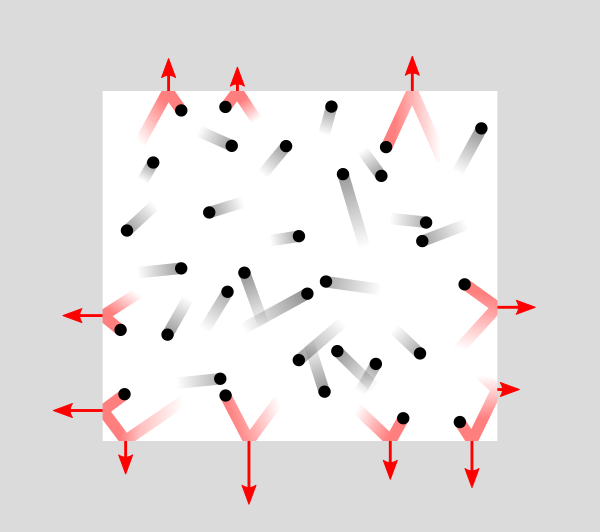 - Размеры молекул пренебрежимо малы по сравнению со средним расстоянием между ними, так что суммарный объём, занимаемый молекулами, много меньше объёма сосуда[63][64][65];