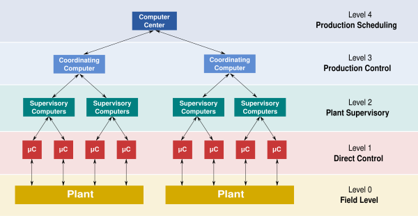 На приведённой диаграмме показана типовая иерархия уровней, характеризующая управление промышленным производством с использованием компьютеризированной системы управления.