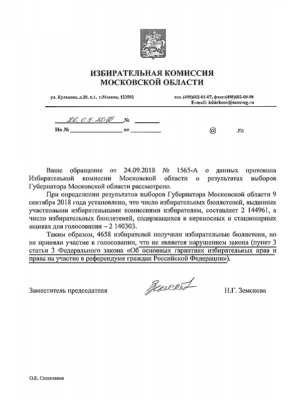 Избирательная комиссия Московской области обозначила, что факт того, что избиратель получил избирательный бюллетень, но впоследствии этот бюллетень в числе прочих не был найден в стационарном/переносном ящике для голосования (то есть это значит, что, как правило, избиратель вынес его с избирательного участка) и количественная разница между выданными и найденными избирательными бюллетенями доказуема, не является нарушением ФЗ «Об основных гарантиях избирательных прав и права на участие в референдуме граждан Российской Федерации» (см. фото).