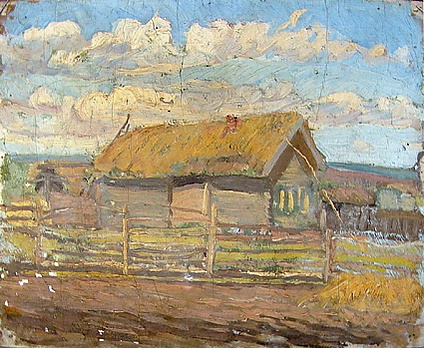 На картине изображён уголок деревенского пейзажа: на переднем плане расположен вскопанный огород, справа видна куча соломы. За низким забором из жердей находится деревянный дом, крытый соломой. За домом простирается поле, а вдали тянется синяя полоска леса. В верхней части композиции изображено голубое небо с лёгкими кучевыми облаками. В работе преобладает тёплый колорит.