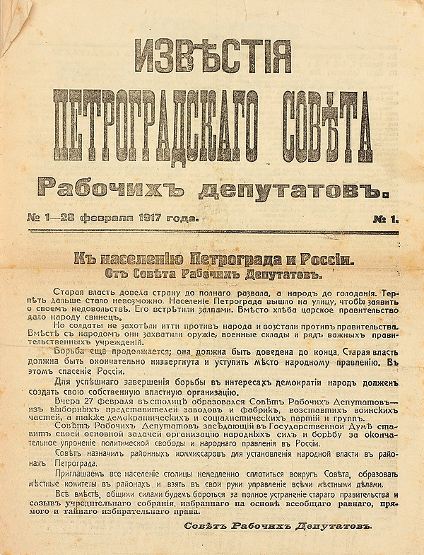 — Извѣстія Петроградскаго совѣта рабочихъ депутатовъ. — 1917. — № 1 (28 февраля). — C. 1.