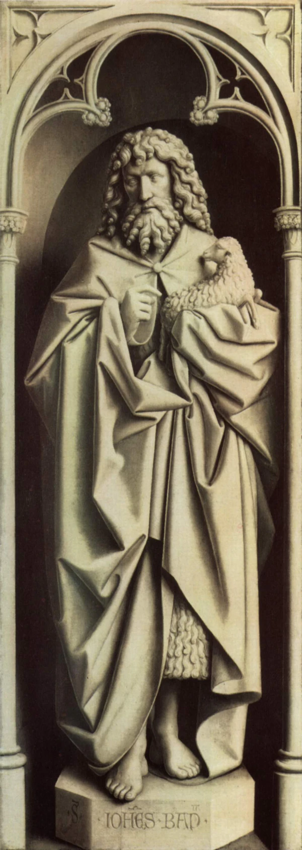 Справа от распятого Иисуса изображён Иоанн Креститель. Хронологически к этому времени Иоанна Крестителя уже не было в живых, на картине Грюневальда он изображён символически как предшественник Христа. Его указательный палец направлен на распятого Христа, а за ним виднеется подпись: