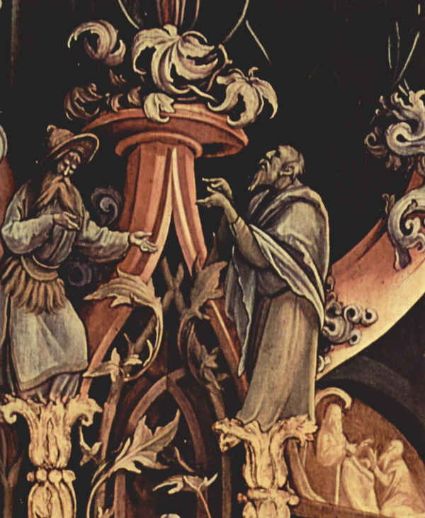 Деревянная кадка с полотенцем и горшком трактуются также как напоминание о том, что алтарь был создан для монастыря, занимавшегося уходом за больными: Орден антонитов заботится не только о душевном, но и телесном исцелении людей.