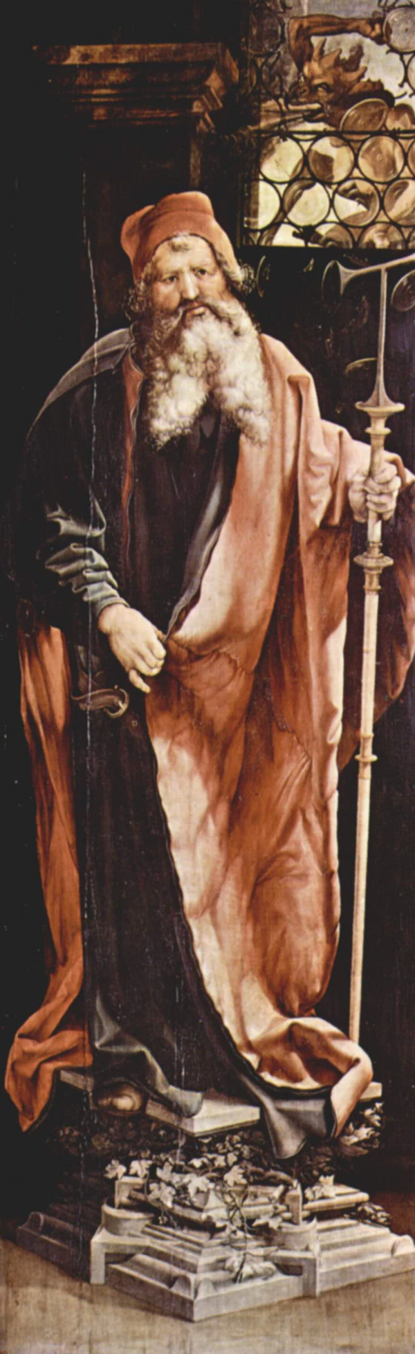 Фигура святого покровителя ордена антонитов на створке Изенгеймского алтаря напрашивалась сама собой. На Антонии тёмно-красное одеяние, в руке его посох, увенчанный Т-образным крестом. Справа над св. Антонием из разбитого окошка выглядывает бесёнок. Это намёк на известные искушения, сопровождавшие святого в жизни и изображённые на третьей развёртке алтаря. Однако Антоний остаётся безучастным к происходящему. Углублённый в свои мысли седобородый старец смотрит вдаль.