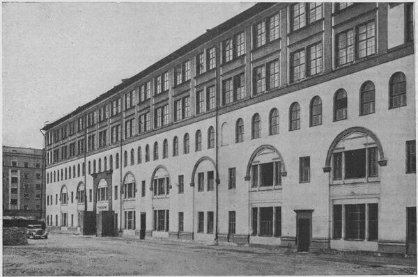 К 1936 были построены скульптурный корпус, литейная и склады. К 1938 году было завершено строительство изоучилища (ныне Балтийская ул., 14) и корпуса мастерских[4][5]. Часть запроектированных автором зданий не была построена[5]. К 1938 году на изофабрике работало 150 скульпторов, 600 лепщиков, модельщиков, мраморщиков и чеканщиков[6]. В здании изоучилища разместилось Центральное художественно-промышленное училище (ЦХПУ)[7][8].