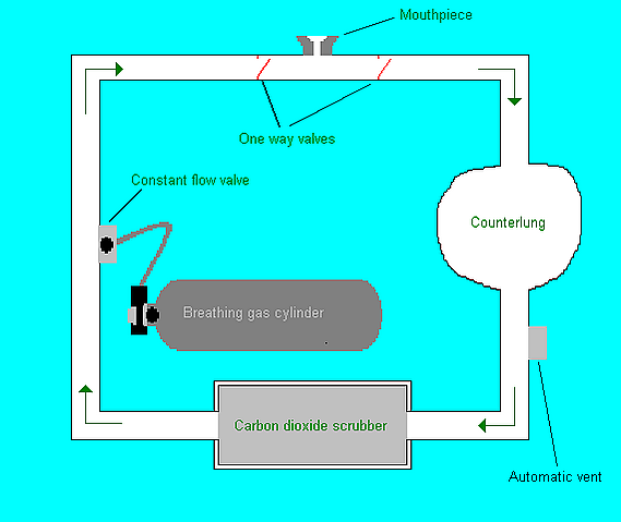 Это родоначальник ребризёров вообще. Первый такой аппарат был создан и применён британским изобретателем Генри Флюссом в середине XIX века при работе в затопленной шахте. Кислородный ребризёр замкнутого цикла имеет все основные детали, характерные для ребризёра любого типа: дыхательный мешок, канистра с химпоглотителем, дыхательные шланги с клапанной коробкой, байпасный клапан (ручной или автоматический), травящий клапан и баллон с редуктором высокого давления. Принцип работы следующий: кислород из дыхательного мешка поступает через невозвратный клапан в лёгкие водолаза, оттуда, через другой невозвратный клапан кислород и образовавшийся при дыхании углекислый газ попадает в канистру химпоглотителя, где углекислый газ связывается натровой известью, а оставшийся кислород возвращается в дыхательный мешок. Кислород, заменяющий потреблённый водолазом, подаётся в дыхательный мешок через калиброванную дюзу со скоростью примерно 1 — 1,5 литра в минуту или же добавляется водолазом с помощью ручного клапана. При погружении обжим дыхательного мешка компенсируется либо за счёт срабатывания автоматического байпасного клапана, либо с помощью ручного клапана, управляемого самим водолазом. Надо заметить, что, несмотря на название «замкнутый», любой ребризёр замкнутого цикла выпускает через травящий клапан пузырьки дыхательного газа во время всплытия. Чтобы избавиться от пузырей, на травящие клапаны устанавливают колпачки из мелкой сетки или поролона. Это простое устройство весьма эффективно и снижает диаметр пузырьков до 0,5 мм. Такие пузырьки полностью растворяются в воде уже через полметра и не демаскируют водолаза на поверхности.
