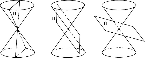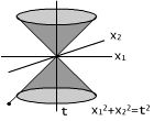 - Простейший пример — изотропные векторы и изотропный конус в — псевдоевклидовом пространстве сигнатуры (2,1). Квадрат длины вектора задаётся формулой . Изотропный конус — прямой круговой конус . Изотропные подпространства — лежащие на нём прямые (образующие), вырожденные подпространства (отличные от изотропных) — плоскости, касающиеся изотропного конуса, то есть имеющие с ним ровно одну общую прямую. Все остальные плоскости являются либо евклидовыми (если пересекаются с изотропным конусом лишь в его вершине), либо псевдоевклидовыми сигнатуры (1,1) (если пересекаются с ним по двум различным прямым)[3].