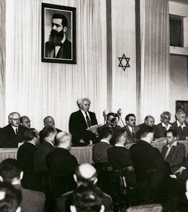 14 мая 1948 года, за один день до окончания британского мандата на Палестину, Давид Бен-Гурион провозгласил создание независимого еврейского государства на территории, согласно плану ООН. Уже на следующий день Лига арабских государств объявила Израилю войну[53], и сразу пять арабских государств (Сирия, Египет, Ливан, Ирак и Трансиордания) напали на новую страну[54].