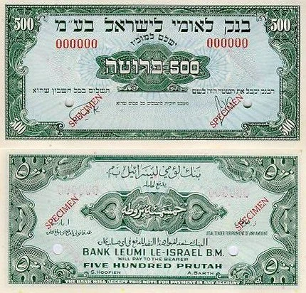 - банкнота в 500 прут Национального банка Израиля обр. 1952 года — 7 февраля 1961;