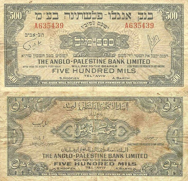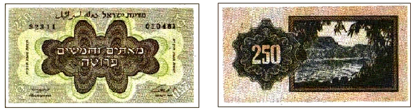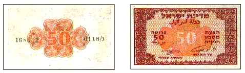 Так, в 1948—1953 годах поступили в обращение 50 и 100 миллей, а затем 50, 100 и 250 прут. Дизайн для них выполнили И. Давид и братья Шамир. Печатала первые выпуски типография «Левин — Эпштейн» в Тель-Авиве, на бумаге низкого качества, без водяных знаков. Так минфин получил дополнительное время на подготовку к выпуску металлических монет[1].