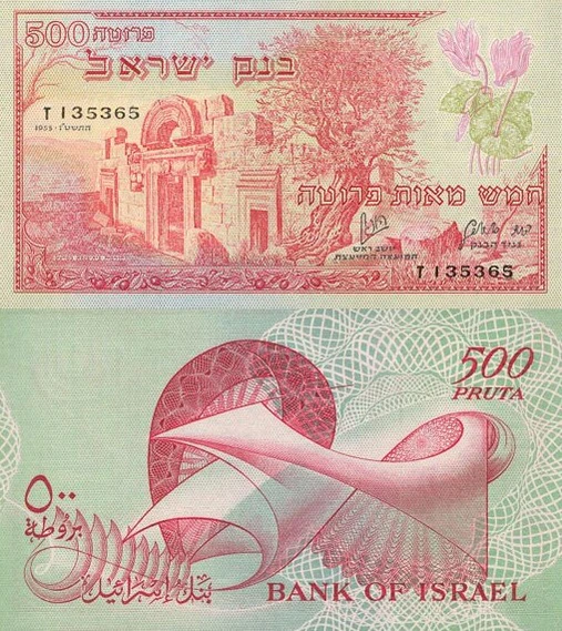 По инициативе первого председателя банка Давида Горовица в 1955 году вошла в обращение первая выпущенная Банком Израиля денежная серия в которой имелась банкнота достоинством 500 прут. Дизайн выполнила фирма Thomas de la Rue and Co из Лондона. Было решено изобразить на банкноте развалины старинной синагоги в деревне Барам (Верхняя Галилея) и два цикламена. Банкнота несла на себе водяные знаки: семисвечник менора (символ Израиля) и цикламены[4].
