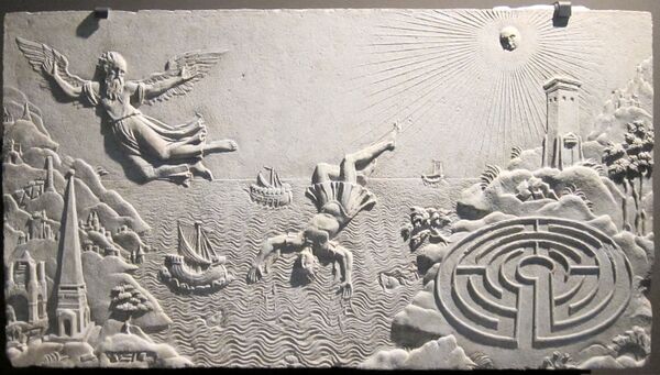 Чтобы спастись с острова Крит от раздражённого Миноса, мастер Дедал сделал для себя и сына крылья, скреплённые воском, и Дедал просил: «Не поднимайся слишком высоко; солнце растопит воск. Не лети слишком низко; морская вода попадёт на перья, и они намокнут». Но уже во время перелёта в Элладу Икар настолько увлёкся полётом, что забыл наставление отца и поднялся очень высоко, подлетев слишком близко к Солнцу. Лучи Солнца растопили воск, Икар упал и утонул[2] недалеко от острова Самос в море, которое и получило в этой части название Икарийского[3]. Его тело, прибитое волнами к берегу, было похоронено Гераклом на маленьком островке Долиха, названном в его честь Икария[4][5].