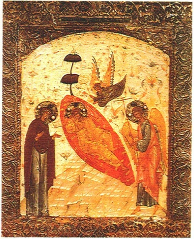 «Царствовавший в осроенском городе Эдесса царь Авгарь послал живописца нарисовать похожее изображение Господа. Когда же живописец не мог этого сделать по причине сиявшего блеска лица Его, то сам Господь, приложив кусок материи к своему божественному и животворящему лицу, напечатлел на куске материи Свой образ и при таких обстоятельствах послал это Авгарю по его желанию.»[5]