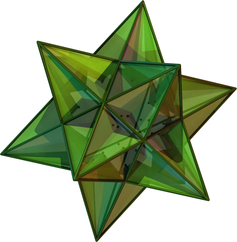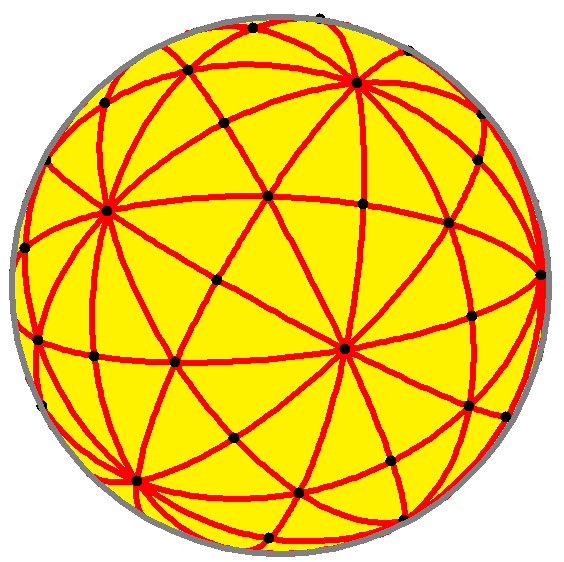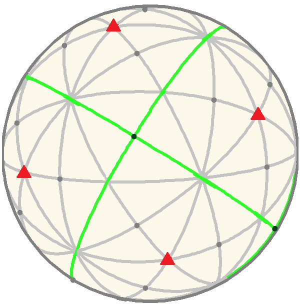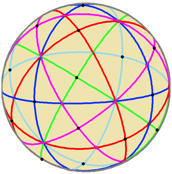 | Рёбра сферического соединения пяти октаэдров представляют 15 плоскостей зеркального отражения в виде больших цветных окружностей. Каждый октаэдр может представлять 3 ортогональных плоскостей зеркального отражения по его рёбрам. | |