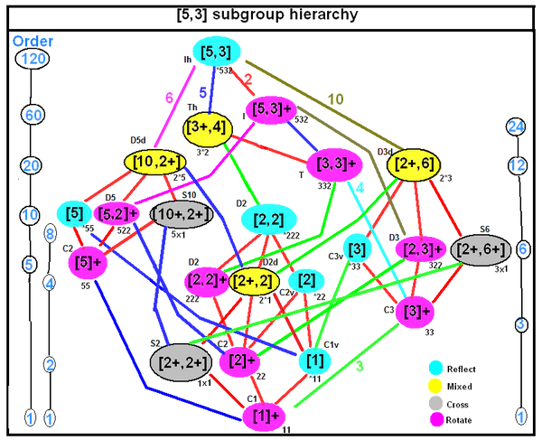 Полная икосаэдральная группа Ih имеет порядок 120. I является нормальной подгруппы группы Ih индекса 2. Группа Ih изоморфна , или , с центральной симметрией, соответствующей (1,-1), где Z2 записывается мультипликативно.