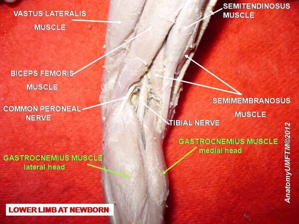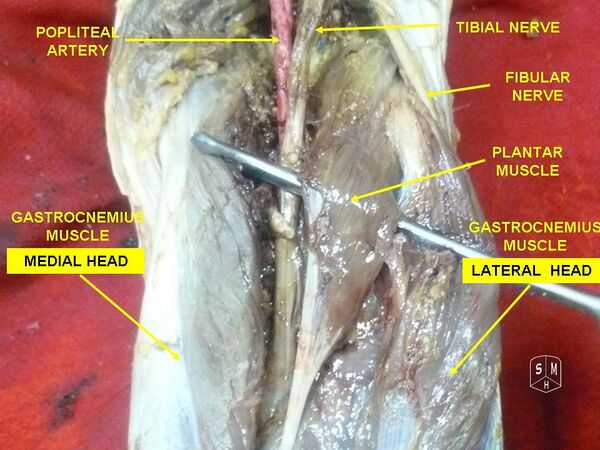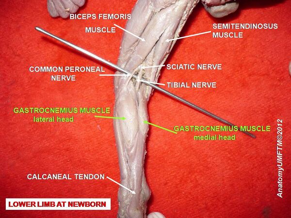 Икроножная мышца образована двумя мощными мясистыми головками — медиальной и латеральной. Более мощная медиальная головка, caput mediale, начинается от подколенной поверхности над медиальным мыщелком бедренной кости, а латеральная головка, caput laterale, — симметрично ей, но несколько ниже, над латеральным мыщелком бедренной кости. Под каждым из сухожилий указанных головок на мыщелках располагаются соответственно медиальная подсухожильная сумка икроножной мышцы, bursa subtendinea m. gastrocnemii medialis и латеральная подсухожильная сумка икроножной мышцы, bursa subtendinea m. gastrocnemii lateralis. Своими начальными отделами головки ограничивают снизу подколенную ямку. Направляясь книзу, обе головки соединяются вместе примерно на середине голени, а затем переходят в общее сухожилие, которое, слившись с сухожилием m. soleus, продолжается в массивное пяточное (ахиллово) сухожилие tendo calcaneus (Achillis), прикрепляющееся к задней поверхности бугра пяточной кости.[1]
