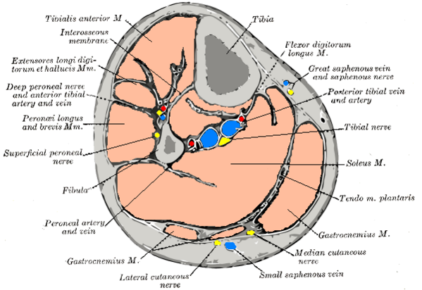 Антагонистом является передняя большеберцовая мышца. Каждая из глав икроножной мышцы иннервируются ветвями большеберцового нерва, с корнем в S1 и S2. Площадь кожного покрова мышцы иннервируют нервы из корешков L4, L5 и S2.[3]