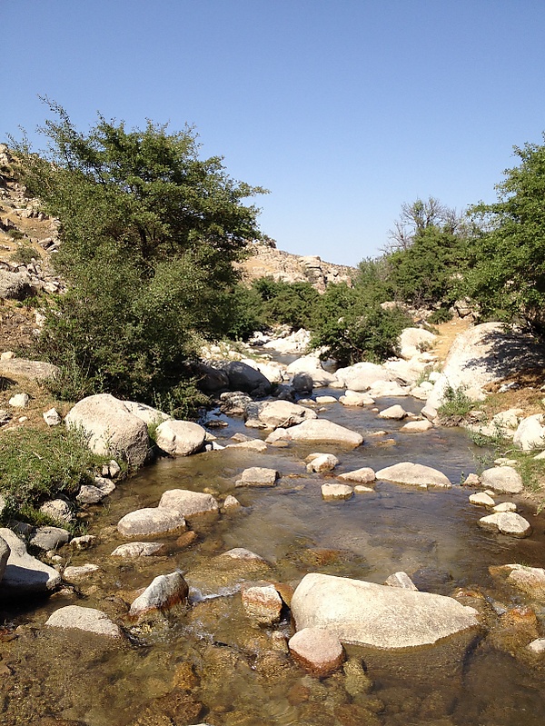 В нижнем течении проходит в овраге, по правому берегу реки здесь располагается гравийный карьер. Далее, приблизительно до населённого пункта Янгиарык, представляет собой сухое русло[3].