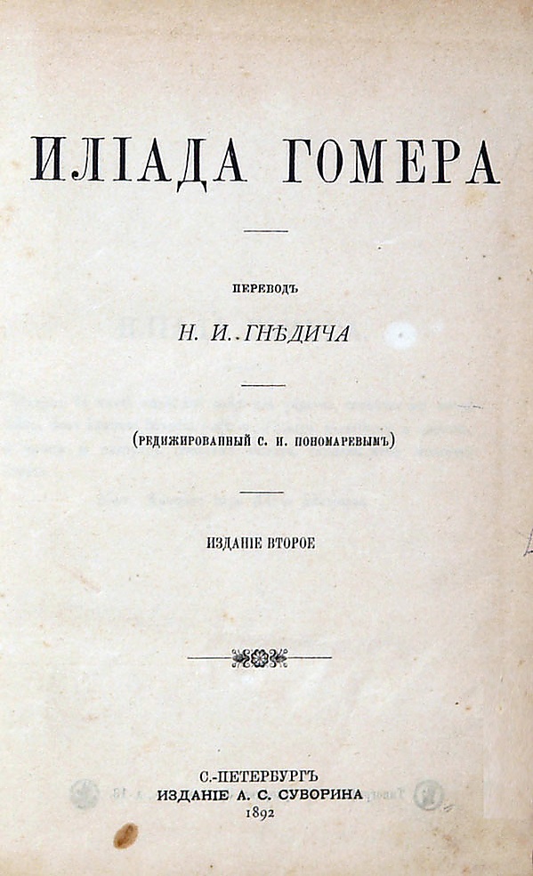 - Илиада Гомера / Пер. Н. И. Гнедича, редижированный С. И. Пономарёвым. — 2-е изд. — СПб.: А. С. Суворин, 1892. — LXXXVI, 440 с.