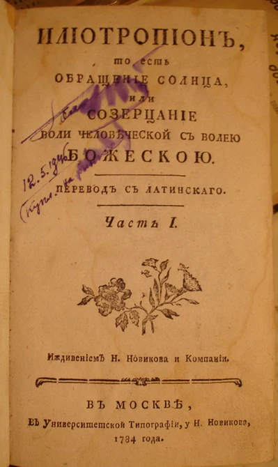 В 1714 году Иоанн Тобольский, в Чернигове, переводит и издаёт этот же труд в пяти книгах со следующим длинным заглавием: «Илиотропион, то есть Подсолнечник, представляющий сообразование человеческой воли с Божественной, переложенный с латинского на славяно-русский язык трудами высокопреосвященнейшего архиепископа Черниговского Иоанна Максимовича, впоследствии митрополита Тобольского и всей Сибири, изданный по его же благословению в типографии Св. Троицкой Ильинской Черниговской обители, напечатанный року 1714. Пять книг». Святитель Иоанн Тобольский для своего перевода использовал оригинальный латинский текст[2][3].