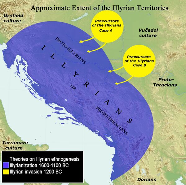 В представлениях древних, Иллирия простиралась к западу от Фессалии и Македонии и к востоку от Италии и Реции вплоть до Истрии к северу. Впоследствии стали делать различие между так называемой греческой Иллирией и Иллирией варварской. Первая называлась также новым Эпиром и представляла собой полную известковых горных цепей и прекрасных пастбищ страну, которую ограничивали Эпир, Македония, горы Скард и р. Дридон.