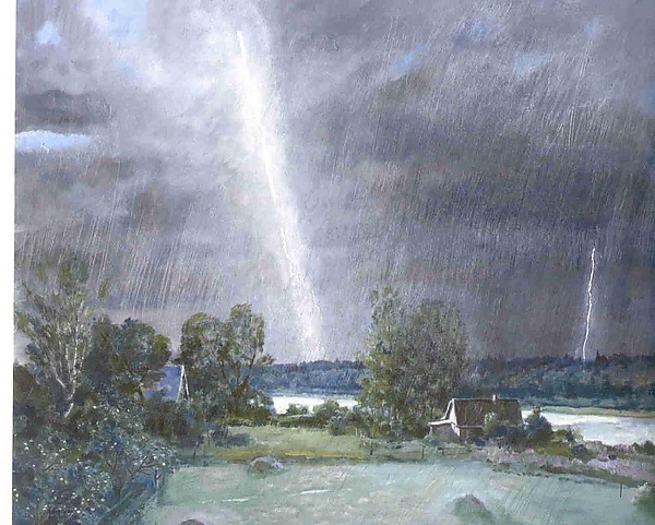 На полотне представлен сельский пейзаж во время грозы. На переднем плане изображён луг со стогами сена, переходящий в дальний план с группой деревьев и протекающей рекой. На противоположном берегу располагается густой лес. Над пейзажем нависает тёмное небо, исчерченное дождём, в котором заметны две вспышки молний. Левая молния, расположенная ближе к зрителю, выделяется крупными размерами, яркостью и розоватым свечением.