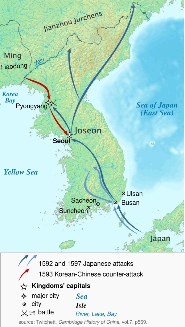 Из-за низкой боеспособности корейской армии японцы очень быстро продвигались по стране: уже через 20 дней ими был захвачен Сеул, корейские войска потерпели поражение у реки Имджинган, захватчики продвинулись далеко на север. Двор бежал на север, в г. Ыйджу на берегу реки Амноккан, откуда государь Сонджо послал минскому императору мольбу о помощи. Правители Мин не сразу решили оказать помощь Корее — при дворе императора Ваньли сомневались, что это не провокация, так как военачальники и сановники никак не могли поверить, что на разгром Кореи японцам потребовалось всего несколько месяцев.