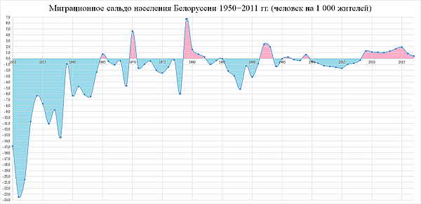 Большую часть периода независимости Белоруссия имела миграционный прирост со всеми государствами СНГ и странами Прибалтики, но он был невелик и не компенсировал убыли за счёт естественного движения[6]. Положительное сальдо миграции было максимальным на протяжении 1992—1993 годов.