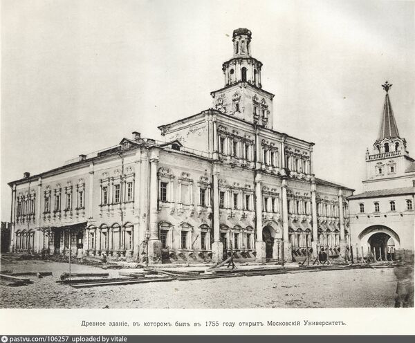 Императорский Московский университет, учреждённый в 1755 году, стал первым классическим российским университетом[3]. Создание университета стало возможным благодаря сотрудничеству М. В. Ломоносова с И. И. Шуваловым, просвещённым вельможей, фаворитом императрицы Елизаветы Петровны. В результате их совместной работы в июне—июле 1754 года был написан Проект об учреждении Московского университета, одобренный 19 июля Правительствующим сенатом. Среди причин, по которым университет планировалось открыть именно в Москве, его создатели называли «великое число в ней живущих дворян и разночинцев», центральное положение Москвы в Российском государстве, доступность жизни в Москве для приезжих и дешевизна их содержания, потребность жителей Москвы и окружающих губерний в хорошем образовании для своих детей. После принятия принципиального решения об открытии Московского университета указом Елизаветы Петровны от 8 (19) августа 1754 ему был передан «Аптекарский дом» у Воскресенских ворот Китай-города — первое из зданий Московского университета. Подготовку здания проводил архитектор князь Дмитрий Ухтомский, которому из средств Статс-конторы была выделена одна тысяча рублей. Торжественное открытие университета планировалось в том же (1754) году[4], однако из-за задержки с ремонтом здания было перенесено на начало следующего года[5].