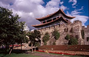В 1381 году Минская империя сумела отвоевать в Юньнани (бывшая территория королевства Дали) обширные земли на юго-западе. К концу XIV века 200 тысячам военных поселенцев было выделено около 2 миллионов му (130 тысяч гектаров) земли в будущих провинциях Юньнань и Гуйчжоу[30]. Ещё около полумиллиона китайцев присоединилось к первым поселенцам позднее, эти миграции значительно изменили этнический облик региона, так как ранее около половины местного населения (1,5 млн человек) не были ханьцами[30]. В этих районах Минская империя осуществляла политику двойной администрации: области, где китайское население преобладало, управлялись по минским законам и обычаям, области, где большинство населения принадлежало по крови к местным племенам, управлялось по местным обычаям, в то время как племенные вожди клялись соблюдать порядок и выплачивать дань в обмен на то, что их снабжали китайскими товарами[30]. В 1464 году племена мяо и яо подняли восстание против китайского владычества, но минский двор направил против них из центра страны 30-тысячную армию (среди прочих народов, в ней была тысяча монголов), к которым присоединилось 160 тысяч солдат, мобилизованных на месте (в провинции Гуанси), и два года спустя восстание было подавлено[31]. Позднее новое восстание было подавлено армией под руководством чиновника и философа Ван Янмина (1472—1529), по его настоянию было учреждено совместное правление для китайцев и местных племён для того, чтобы местные обычаи также учитывались в каждом принимаемом решении[31].