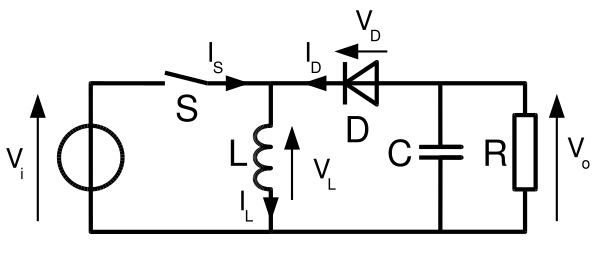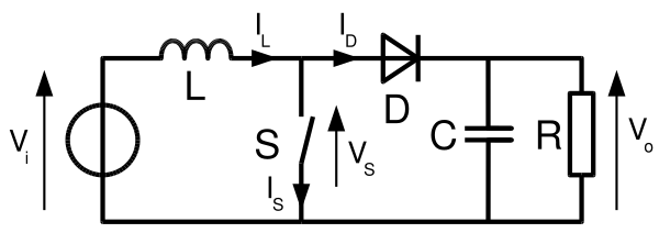 Названия в англоязычной литературе — boost converter (step-up converter). Если ключ S замкнут, то диод D закрыт, и через дроссель L течёт линейно нарастающий ток от источника. Когда ключ размыкается, ток дросселя, который не может измениться мгновенно, начинает протекать через диод D и конденсатор C (заряжая его). К началу следующего цикла практически линейно спадающий ток через конденсатор может уменьшиться до нуля, однако приложенное к нагрузке R напряжение конденсатора почти постоянно — амплитуда пульсаций тем меньше, чем больше ёмкость конденсатора. В отличие от предыдущей схемы, здесь дроссель не является элементом фильтра. Напряжение на нагрузке всегда больше напряжения источника[10][18].
