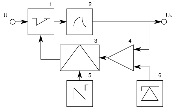 Как и в предыдущей схеме, в процессе работы накопитель энергии (2) или подключён к входному напряжению, или передаёт накопленную энергию в нагрузку. В результате на выходе имеется некоторое среднее значение напряжения, которое зависит от входного напряжения и скважности[11] импульсов управления ключом (1). Вычитатель-усилитель на операционном усилителе (4) сравнивает выходное напряжение с опорным напряжением (6) и усиливает разность, которая поступает на модулятор (3). Если выходное напряжение меньше опорного, то модулятор увеличивает отношение времени открытого состояния ключа к периоду тактового генератора (5). При изменении входного напряжения или тока нагрузки скважность импульсов управления ключом изменяется таким образом, чтобы обеспечить минимальную разность между выходным и опорным напряжением.