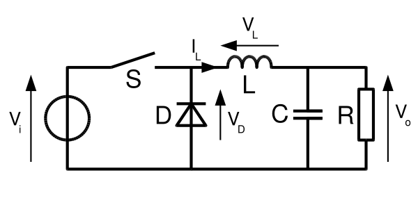 В нижеприведённых схемах в качестве ключа S могут использоваться полевой транзистор, биполярный транзистор или тиристор, цепь управления ключом для простоты не показана. Отношение времени замкнутого состояния ключа к сумме длительностей замкнутого и разомкнутого состояний называют коэффициентом заполнения (или рабочим циклом — англ. duty cycle)[2].