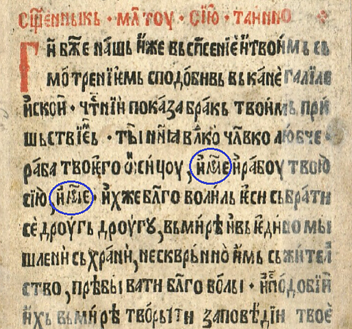 Пример: «Помолимся о великом господине и отце нашем, Святейшем Патриархе имярек, и о господине нашем преосвященнейшем митрополите (или архиепископе, или епископе) имярек, и всей во Христе братии нашей» (прошение из ектеньи вседневной полунощницы)[8]. Вместо первого имярек священник должен назвать имя патриарха, а вместо второго имярек священник должен назвать имя епархиального архиерея.