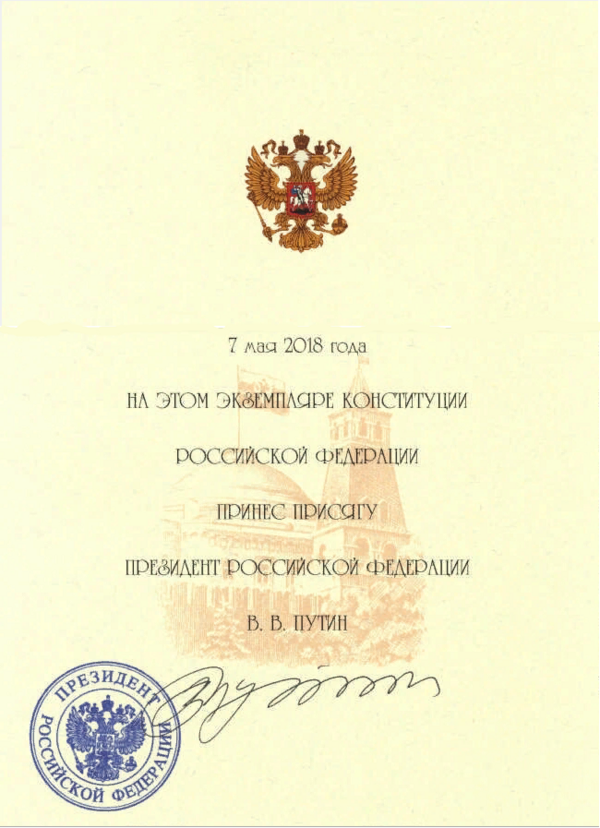 - Вступающий в должность глава государства, положив правую руку на Специальный экземпляр Конституции Российской Федерации произносит текст присяги. После этого президент России считается вступившим в должность.