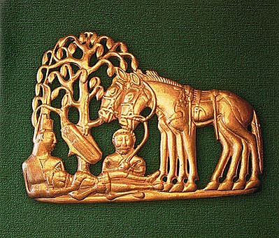 В первую очередь с саргатами (а частично с баитовскими племенами) ассоциируются курганные некрополи, количество которых достигает 177, причём диаметр отдельных курганных насыпей превышает 60 м[33]. Многие из курганов содержат высокохудожественные изделия из золота, серебра, драгоценных камней и многочисленные украшения, изготовленные в мастерских Древнего Египта, рабовладельческих государств Северного Причерноморья и Средней Азии[22]. Так, при раскопках Тютринского могильника возле с. Суерка в 1981 году Н. П. и А. В. Матвеевыми были обнаружены бусины из голубой шпинели, которая добывается только в Индостане, на Шри-Ланке и Калимантане, а также миниатюрный (длина менее 2 см) фаянсовый амулет Гарпократа (эллинистическая традиция изображения древнеегипетского бога Гора)[34]. По мнению А. В. Матвеева, богатство погребений саргатской эпохи может свидетельствовать о том, что на рубеже нашей эры долина была местом захоронения представителей одного или нескольких «царских» родов саргатского племенного объединения[22], источником обогащения которых являлся контроль над поставками стратегических товаров в систему Великого шёлкового пути[35].