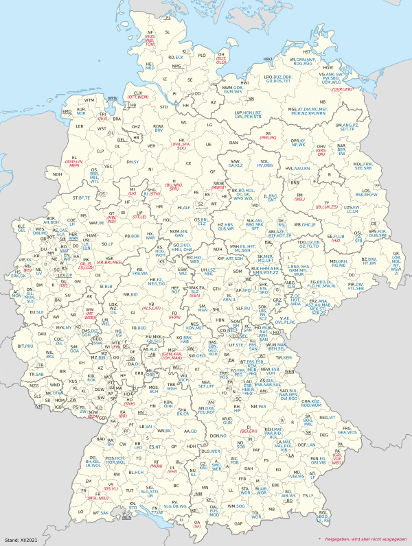 В Германии действует более 700 региональных кодов номерных знаков. С 2012 года в рамках либерализации активно возвращаются старые исторические коды (нем. Altkennzeichen)[13][14].