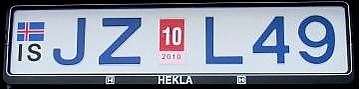 Исландский автомобильный номер включает в себя три буквы и две цифры. В номерах предыдущего образца (до июля 2007 года) было по две буквы и три цифры. Комбинации букв не имеют связи с регионом. Посередине номера расположена наклейка, указывающая месяц и год прохождения следующего ТО. Слева находится изображение флага Исландии и код страны.