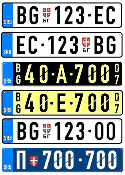 Автомобильные номера в Сербии состоят из двух букв кода региона, трех цифр и двух букв, разделенных дефисом (например, BG 123-AA). Код региона и трехзначная цифра разделяются Гербом Сербии. Синие поля располагаются в левой части, как и в странах ЕС, имея международный код страны SRB.