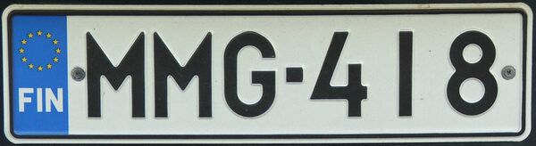 Номерной знак представляет собой прямоугольную светоотражающую пластину с белым фоном, на которую наносятся буквенно-цифровые комбинации чёрного цвета. Кодовая группа состоит из двух частей: две или три буквы, далее символ «тире», затем изображается до трёх цифр. В левой части знака располагается синий прямоугольник с символом ЕС, а также сокращённое обозначение страны — FIN, нанесённое белым цветом.