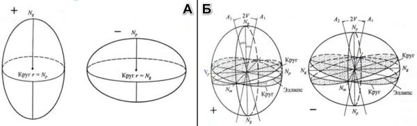 На рисунке показаны оптические индикатрисы одноосных кристаллов (А) и двуосных (Б). Знаками и обозначены оптически положительные и отрицательные кристаллы соответственно.