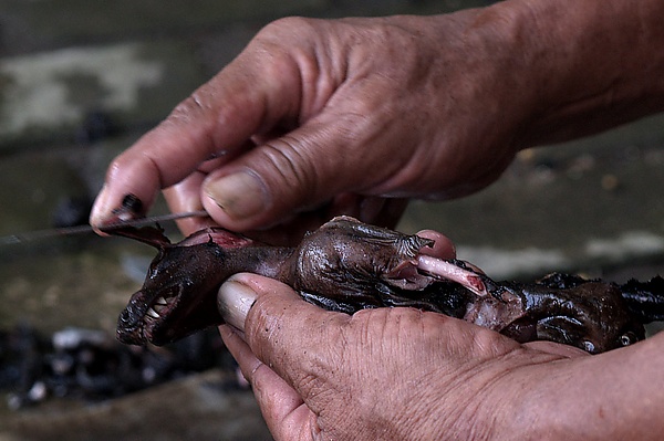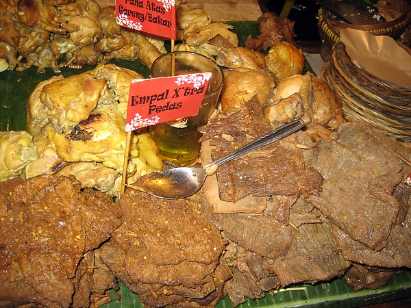 Помимо мяса домашнего скота, птицы, рыбы и морепродуктов, в пищу в различных регионах употребляется мясо диких животных, в том числе достаточно экзотических — змей, черепах, крупных летучих мышей из семейства крылановых, а также собак и обезьян (так, блюда из летучих мышей исторически пользуются некоторой популярностью в различных районах Явы, из собачатины — на той же Яве, а также на Малых Зондских островах[80][81]). Эти виды мяса нигде не составляют значительной части постоянного рациона, однако факт их использования в индонезийской кухне достаточно широко известен за пределами страны — в частности, благодаря опубликованным воспоминаниям президента США Барака Обамы, проведшего детство в Индонезии, о потреблении в Джакарте блюд из собачатины, змей и кузнечиков[прим. 2][80][81][82][83][84][85].