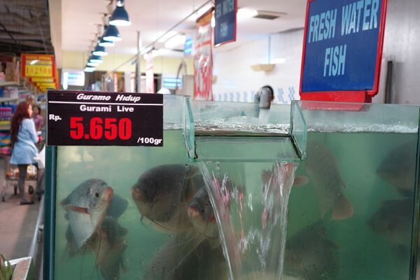 В силу разнообразия ихтиофауны индонезийской акватории ассортимент рыбы и морепродуктов в прибрежных районах весьма широк. Более всего в пищу употребляются различные виды, относящиеся к семейству скумбриевых. Наиболее популярными морепродуктами являются креветки и кальмары. Во внутренних районах в пищу активно используется пресноводная рыба — как выловленная, так и искусственно разведённая. К числу наиболее востребованных в кулинарии пресноводных видов относятся канальный сомик, тилапия, карп, гурами[прим. 1][77][78]. Последняя пользуется особенно большой популярностью в яванской кухне — на Яве искусственный пруд с гурами, разводимыми на еду, имеется практически в каждой деревне[79].