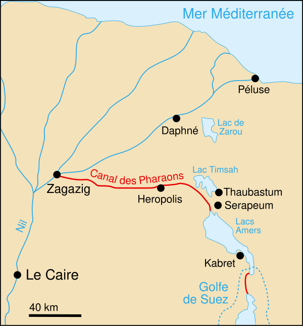 У выхода канала в Красное море был построен порт Арсиноя, названный в честь второй жены царя. Постепенное усыхание пелузийского рукава Нильской дельты сделало канал несудоходным уже при царице Клеопатре VII (I век до н. э.). (Его восстановили при римском императоре Траяне (начало II века н. э.), после чего он получил название «реки Траяна»[3] или «рва Траяна» (лат. fossa Traiana)[4].) Перипл Эритрейского моря вспоминает о времени, когда морская торговля между Египтом и Индийского субконтинента не включала прямого сообщения; грузы тогда направлялись судами к Адену
