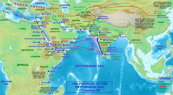 Торговля через Индийский океан расцвела в I—II вв. н. е. Моряки использовали муссоны для пересечения океана из портов Беренис , Лейкос Лимен [6] и Миос Гормос на побережье Красного моря Римского Египта к портам Музириса и Нелкинды на Малабарском побережье. Основными торговыми партнерами в Южной Индии были тамильские династии Пандея, Чола и Черас. В Индии найдено много римских артефактов, например на археологическом объекте Арикамеду в Пудучерри. Наиболее подробное описание индо-римской торговли содержится в документе, предположительно середины I-го века н. э., известном как «Перипл Эритрейского моря». В нём упомянуты не только римские гавани Эритрейского моря (Арсиноя на месте современного Суэца, Береника и Миос-Гормос), но и целый ряд индийских портов. Лишь немногие из них удаётся идентифицировать по археологическим материалам (Барбарик — вероятно, современный Карачи), от большей же части сохранились только имена-гапаксы.