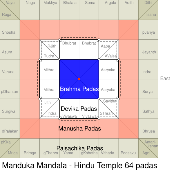 Четыре кардинальных направления помогают создать ось индуистского храма, вокруг которой формируется идеальный квадрат в доступном пространстве. Круг мандалы описывает квадрат. Квадрат считается божественным из-за его совершенства и как символический продукт знания и человеческой мысли, в то время как круг считается земным, человеческим и наблюдаемым в повседневной жизни (луна, солнце, горизонт, капля воды, радуга). Каждый из них поддерживает другой[4]. Квадрат разделён на идеальные квадратные сетки. В больших храмах это часто структура 8×8 или 64 сетки. В церемониальных надстройках храмов это сетка из 81 подквадрата. Квадраты называются «падами»[8][комм 1]. Квадрат является символическим и имеет ведическое происхождение от огненного алтаря Агни. Выравнивание по сторонам света, аналогично, является продолжением ведических ритуалов трёх огней. Эта символика также встречается в греческой и других древних цивилизациях в виде гномона.