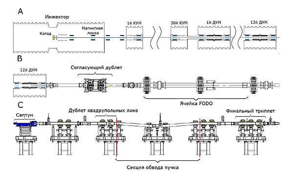 А — инжектор и линейный ускоритель; состоит из инжектора, коротких ускоряющих модулей (КУМ) (всего 30 штук), и длинных ускоряющих модулей (ДУМ), (всего 12 штук).
